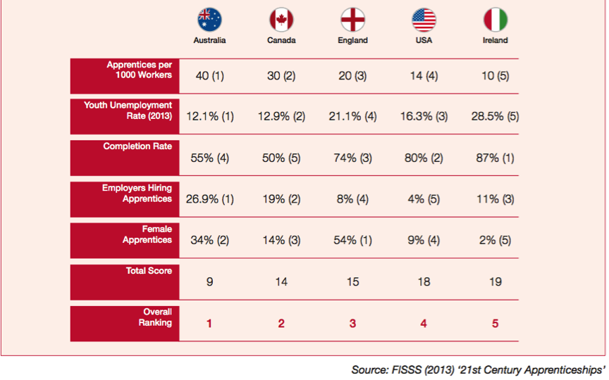 Well, it turns out that we would struggle to pick up a bronze medal. Based on internationally comparable data, out of those five countries, England lies in third place for the number of apprentices per thousand workers and fourth place in terms of the number of firms engaged, see table. The one fillip is that more women undertake apprenticeships in England compared to other English speaking countries examined in the study.