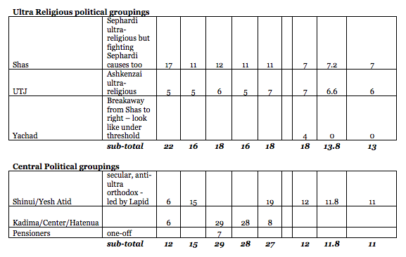 The elections in the United Kingdom are mainly fought around socio-economic issues. In Israel you also have to factor in security-peace, religious-secular and Ashkenazic (originating in Europe)-Sephardim (from North Africa/Middle East)-Russian (the more recent Russians). Add to this the 20 per cent of the electorate who are Israeli Arabs – while in the past there were a number of parties this time they have joined to make one list. The Arab parties have never joined the government coalition.